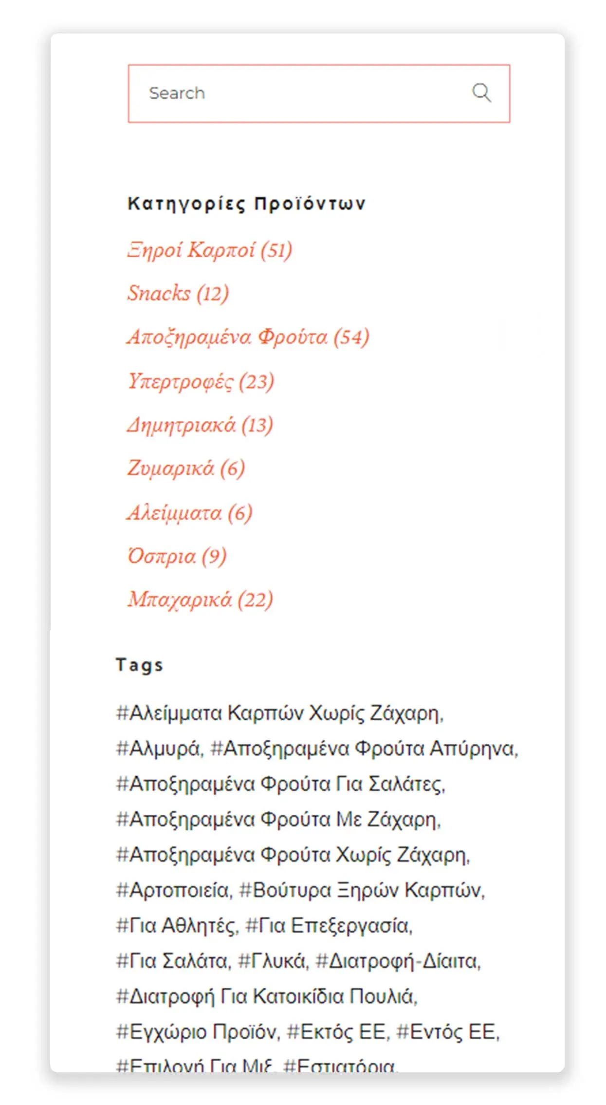 Μια ισχυρή (αλλά εύκολη στη χρήση) εμπειρία αναζήτησης προϊόντων επιτρέπει στους πελάτες να βρίσκουν αυτό που αναζητούν, μέσα από 9 κατηγορίες και 50 tags προϊόντων με λίγα μόνο κλικ. Με τη χρήση των tags οι πελάτες μπορούν να εντοπίσουν το προϊόν που επιθυμούν ανάλογα με τη χρήση του, αλλά παράλληλα βοηθάνε και στην προώθηση της ιστοσελίδας στην αναζητηση της Google (SEO).
